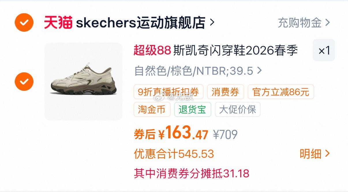 斯凯奇闪穿鞋直播间9折+消费券,到手163.47元
