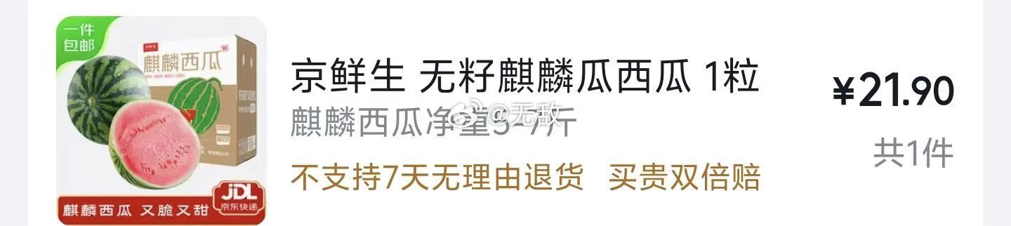 🍉京鲜生无籽麒麟瓜21.9元/粒(5-7斤)