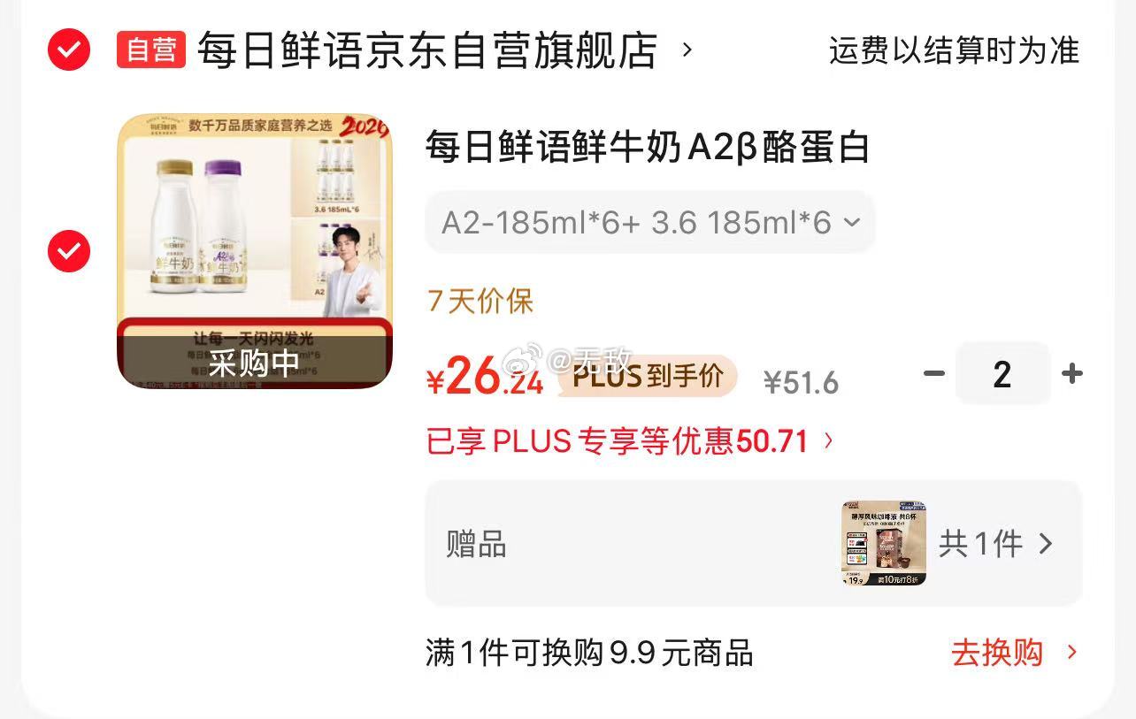 每日鲜语鲜牛奶A2β酪蛋白185ml*6瓶+3.6g蛋白185ml*6瓶