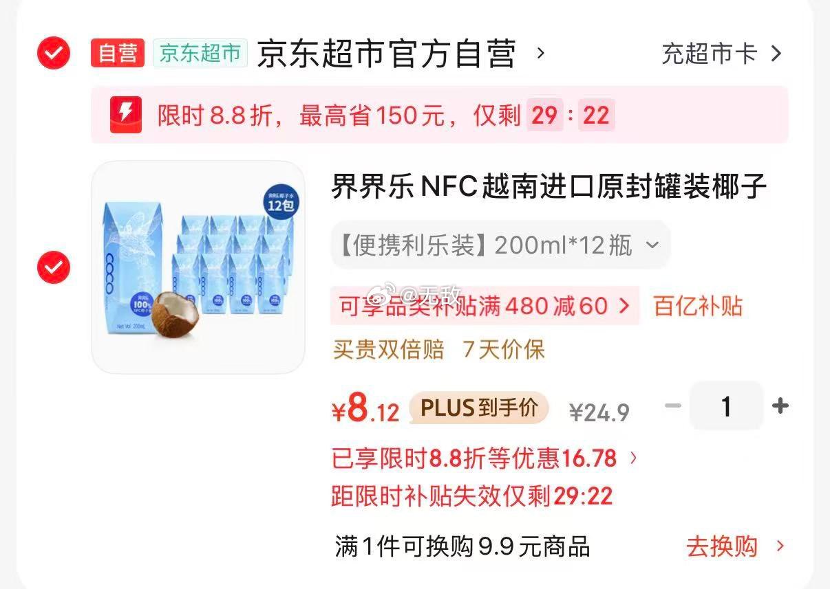 200-20黑五 网页链接 砸或领劵中心19-6 网页链接 plus 200-25劵 网页链接 界界乐NFC越南进口原封罐装椰子水果汁饮料200ml*12瓶,弹8.8折立减,凑后8.12网页链接 凑 网页链接