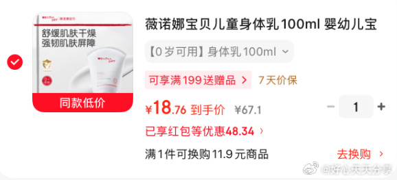【京东】plus领200-25券 网页链接领黑五200-20券网页链接领51-25券网页链接薇诺娜宝贝儿童身体乳100ml 凑后【18.96】薇诺娜宝贝儿童身体乳100ml 婴幼儿宝宝润肤乳干燥舒缓0岁+凑款网页链接