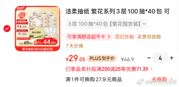 【京东】plus领200-25券 网页链接领黑五200-20券网页链接洁柔抽纸 繁花系列3层100抽*40包 拍4件 凑后每件【29.34】反2.35卡洁柔抽纸 繁花系列3层100抽*40包 可湿水面巾纸 柔韧纸巾卫生纸 整箱凑款网页链接