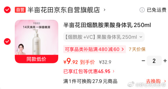 【京东】plus领200-25券 网页链接领黑五200-20券网页链接领63-31券网页链接半亩花田 烟酰胺果酸身体乳250ml 拍2件 凑后每件【10.03】半亩花田烟酰胺果酸身体乳250ml凑款网页链接
