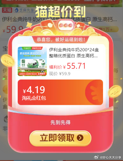 【猫超】部分账号标题下有5元福袋伊利 金典纯牛奶200*24盒整箱 弹礼金伊利金典纯牛奶200*24盒整箱优质蛋白 原生高钙120mg 学生营养从百亿补贴网页链接 搜宝贝标题打开详情页领5红包,点去使用直播间拍 88vip【36.72】