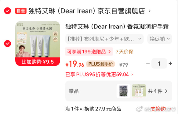 【京东】领黑五200-20券网页链接领79-39券网页链接 入会有8首购礼金独特艾琳 (Dear lrean)香氛凝润护手霜保湿滋润 (布列塔尼+少年+欲望宇宙)105ml 凑后【20.15】可换其他选项独特艾琳(Dear lrean)香氛凝润护手霜保湿滋润(布列塔尼+少年+欲望宇宙)105ml送男女凑款网页链接