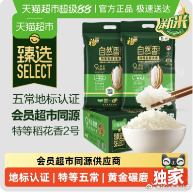 【猫超】部分账号标题下有15元福袋从宝贝页按提示从首页进入淘宝秒杀页面拍福临门 自然香特等五常大米5kg*2袋 88vip【71.95】臻选 福临门自然香特等五常大米5kg*2袋*1箱详情页如能领到3元品类金价更低