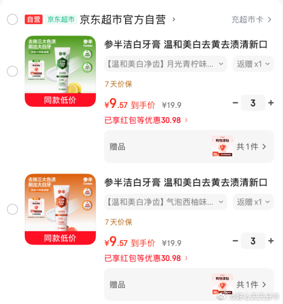 【京东】参半 温和美白牙膏120g 选1款拍3件【30】反15卡,赠品10元津贴 相当于【5】参半洁白牙膏 温和美白去黄去渍清新口气护龈 气泡西柚味120g 参半洁白牙膏 温和美白去黄去渍清新口气护龈 青柠味120g