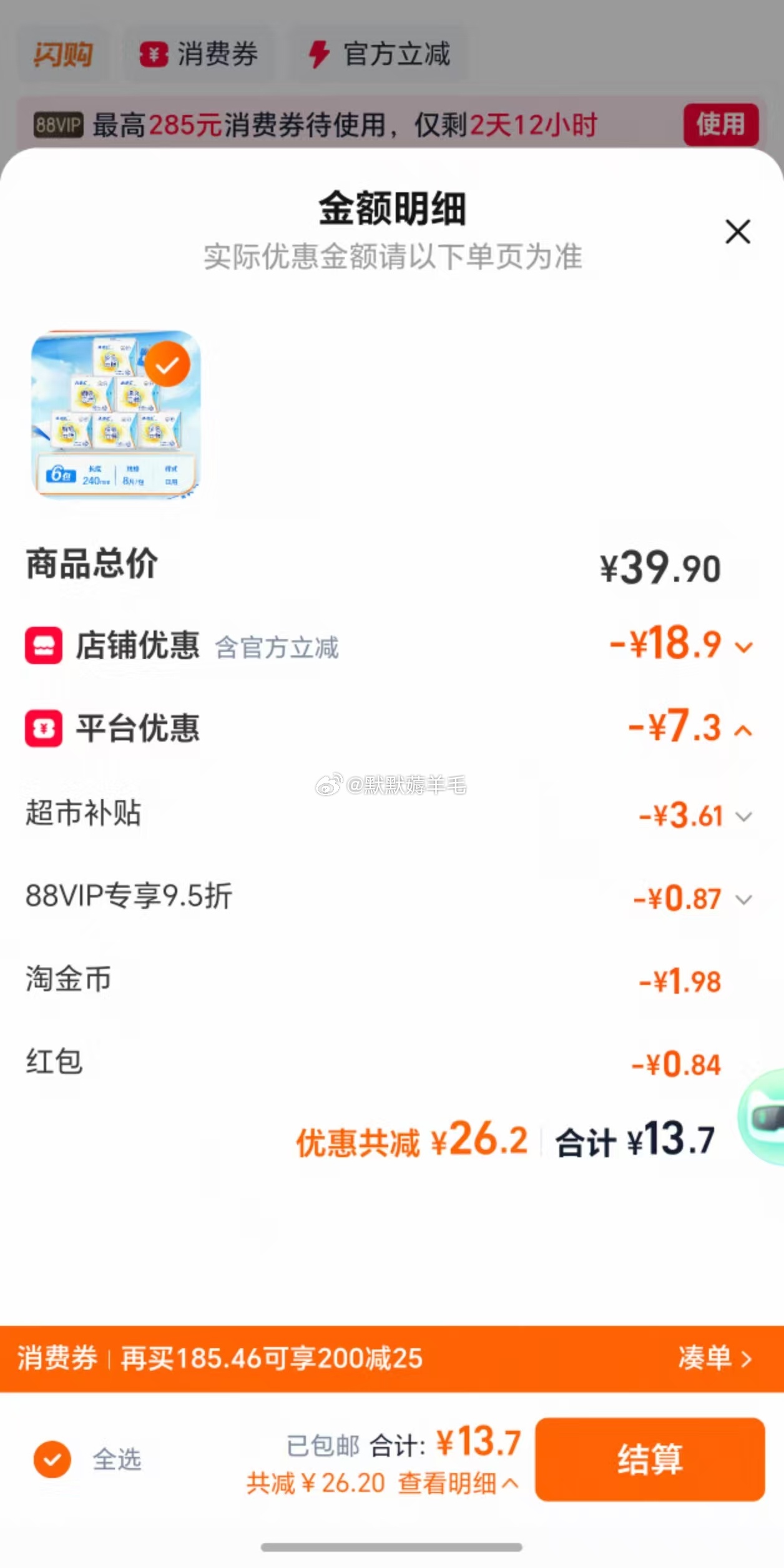 ABC卫生巾48片13.7元 领补贴礼金