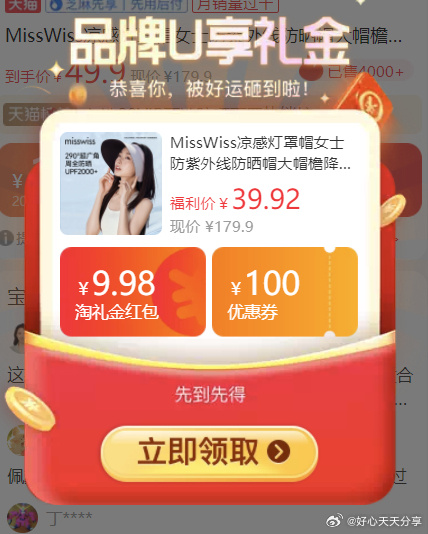 用200-25消费券网页链接MissWiss凉感灯罩帽 遮阳帽 弹礼金和1元红包MissWiss凉感灯罩帽女士防紫外线防晒帽大帽檐降温遮阳帽UPF2000+从淘金币-我的足迹网页链接 凑后【30.99】凑款网页链接