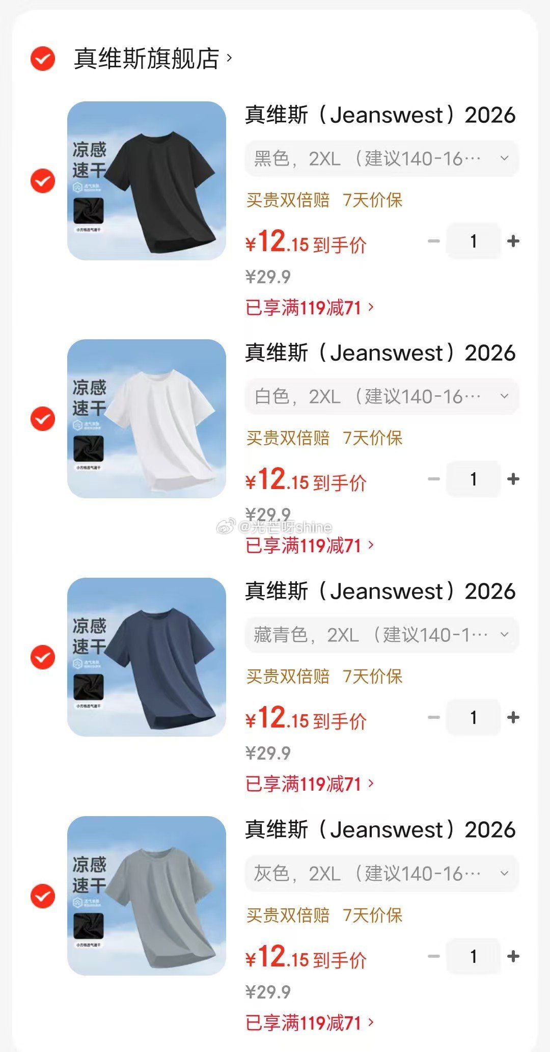 班尼路 防晒衣女冰丝凉感速干连帽面罩一体【39】 班尼路防晒衣女冰丝凉感速干连帽面罩一体设计防晒服指尖拼接设计上衣4 白#纯色... 领119-71 网页链接 真维斯 短袖t恤男士夏季圆领,任选4件【48.6】折12/件 真维斯(Jeanswest)2026新款短袖t恤男士夏季圆领休闲百搭潮流打底...