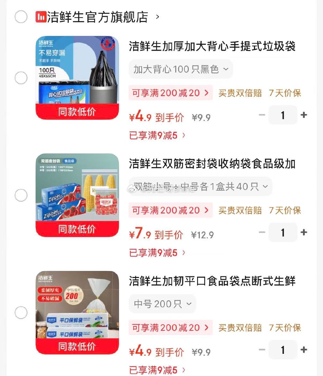 清洁9-5 网页链接 洁鲜生 加厚加大背心手提式垃圾袋100只【4.9】 洁鲜生加厚加大背心手提式垃圾袋酒店塑料袋家用厨房办公室卫生间袋子 加大背心1... 洁鲜生 双筋密封袋收纳袋小号+中号各1盒共40只【7.9】 洁鲜生双筋密封袋收纳袋食品级加厚自封口PE啪嗒袋分装冰箱储物自封袋子 双筋小... 洁鲜生 加韧平口食品袋点断式中号200只【4.9】 洁鲜生加韧平口食品袋点断式生鲜蔬菜水果加厚家用户外方便食品级塑料袋 中号200只