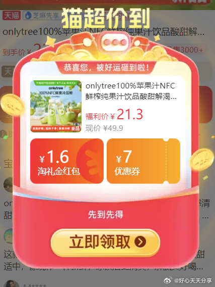 【猫超】onlytree苹果汁NFC果汁19.58元
