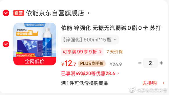 【京东】领黑五200-20券网页链接领49-20券网页链接依能 锌强化 无糖无汽弱碱0脂0卡 苏打水饮料 500ml*15瓶 拍2件 凑后每件【12.8】依能 锌强化 无糖无汽弱碱0脂0卡 苏打水饮料 500ml*15瓶 整箱装凑款网页链接