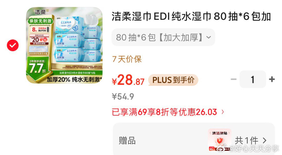 【京东】plus领200-25券 网页链接领黑五200-20券网页链接洁柔 湿巾EDI纯水湿巾80抽*6包 拍2件 凑后每件【27.37】赠品20元清洁津贴 相当于每件【7.37】洁柔湿巾EDI纯水湿巾80抽*6包加厚保湿亲肤手口可用宿舍必备200*150mm凑款网页链接