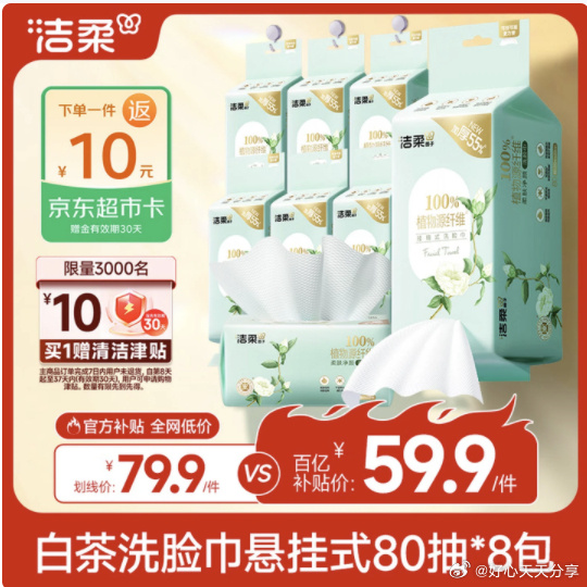 【京东】plus领200-25券 网页链接领黑五200-20券网页链接领200-20惊喜红包网页链接洁柔 洗脸巾白茶悬挂式80抽*8包可挂可抽 拍3件 凑后每件【36.59】洁柔洗脸巾白茶悬挂式80抽*8包可挂可抽 家庭囤货装加大加厚XL码整箱凑款网页链接