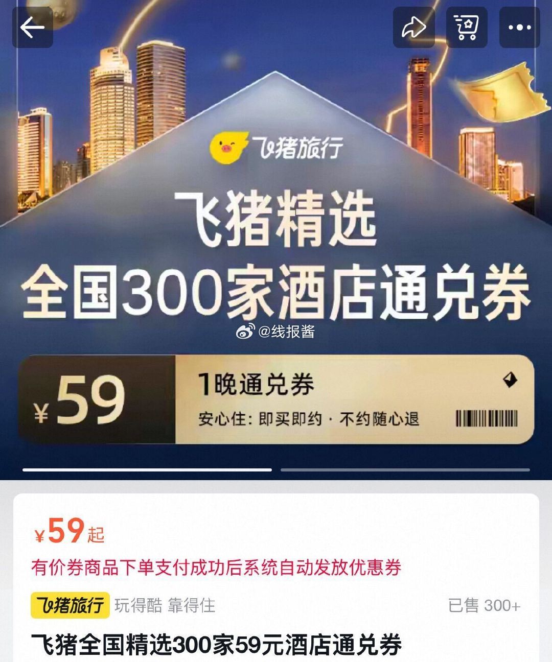 囤59元‼五一可用!飞猪全国300家酒店通兑券