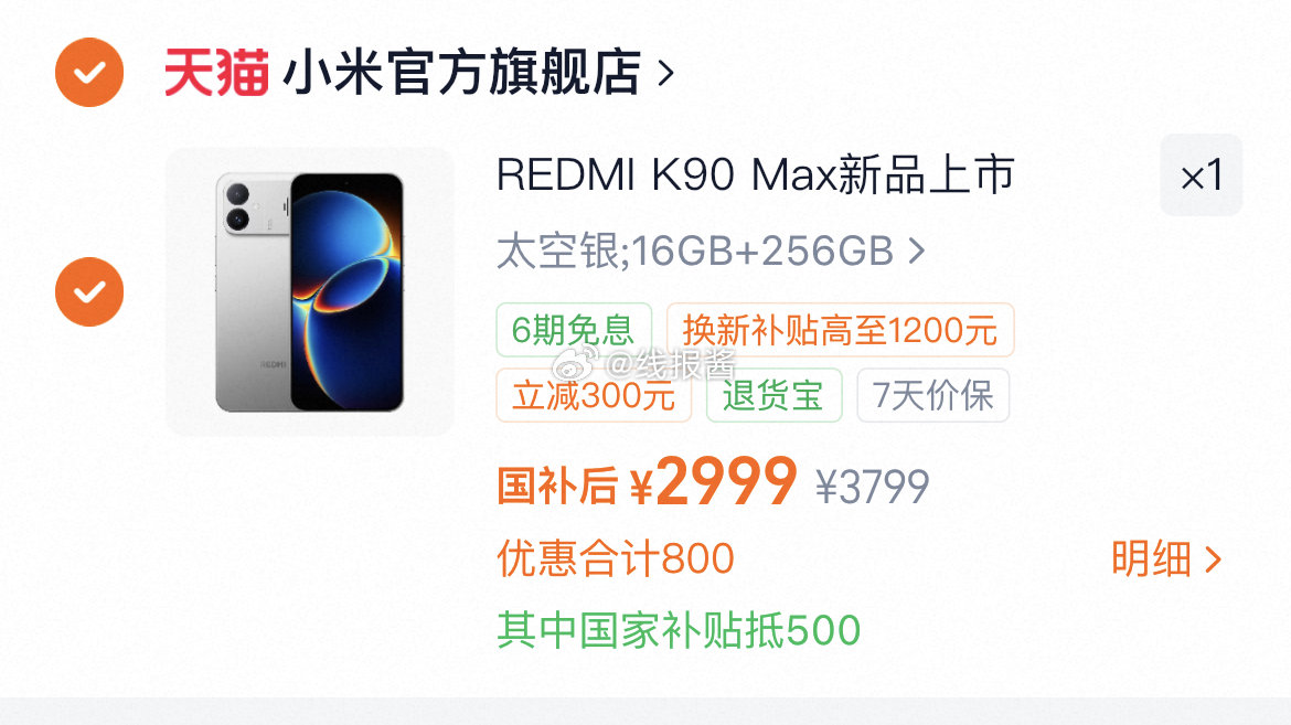 叠国补2999亓‼REDMI K90 Max性能魔王手机16GB+256GB