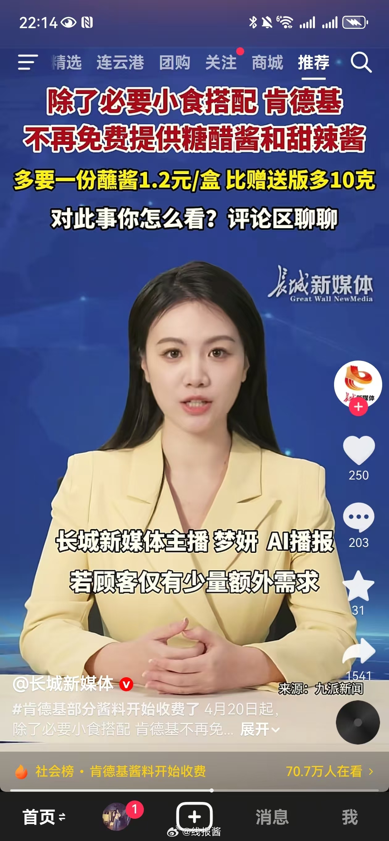 肯德基不再免费提供糖醋酱和甜辣酱😱