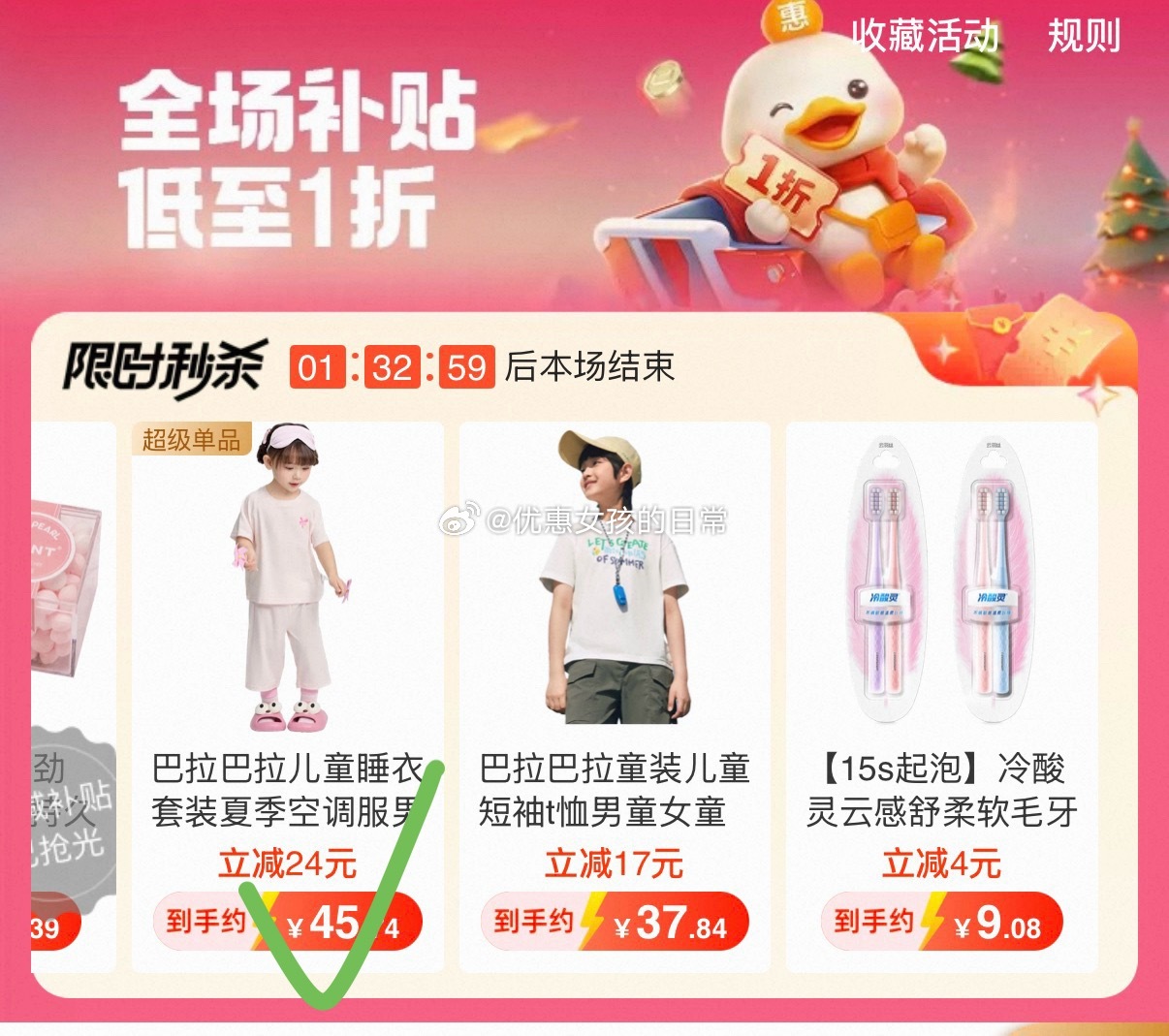 淘宝省钱卡9-5红包,巴拉巴拉儿童睡衣套装34.61元到手👶
