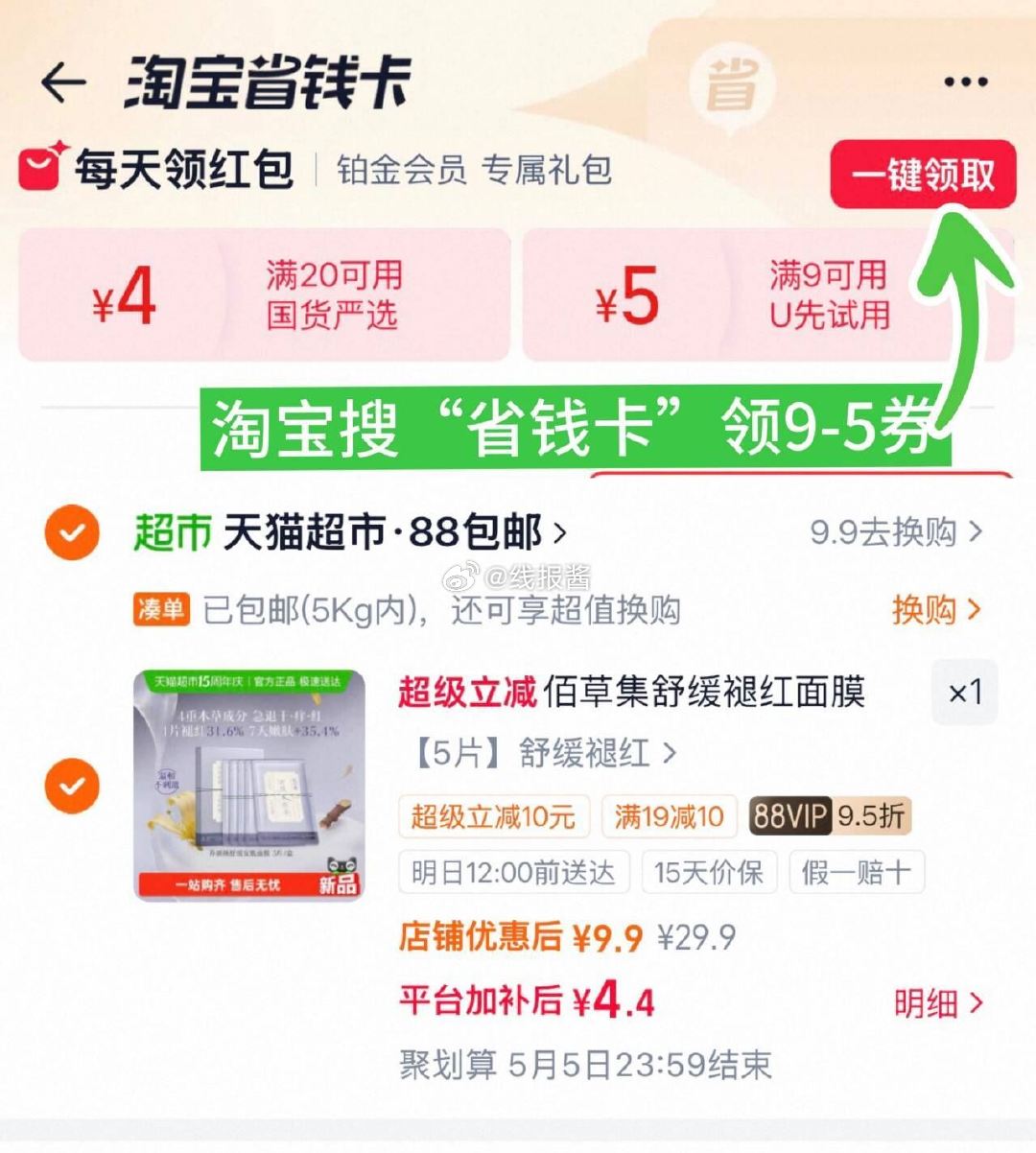 淘寳搜“省钱卡”领5劵,佰草集面膜5片仅4.4亓💰