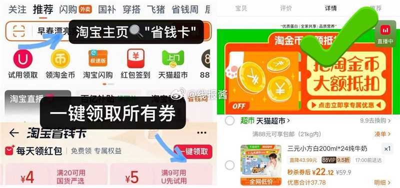 淘宝省钱卡领5元红包,三元牛奶22.1元