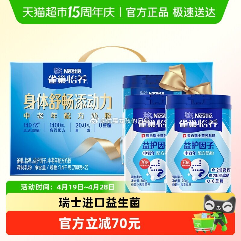 猫超 雀巢怡养益护因子益生菌中老年牛奶粉700g*2罐[下拉领优惠]雀巢怡养益护因子益生菌中老年牛奶粉700g*2罐礼盒 去淘金币页面-足迹抵扣抵9.95网页链接 凑200-25消费券,商品下领99-10,vip到手【77.87】 凑1件 李宁新款男士长袖泳衣成人专用泡温泉海边沙滩上衣双层游泳裤套装
