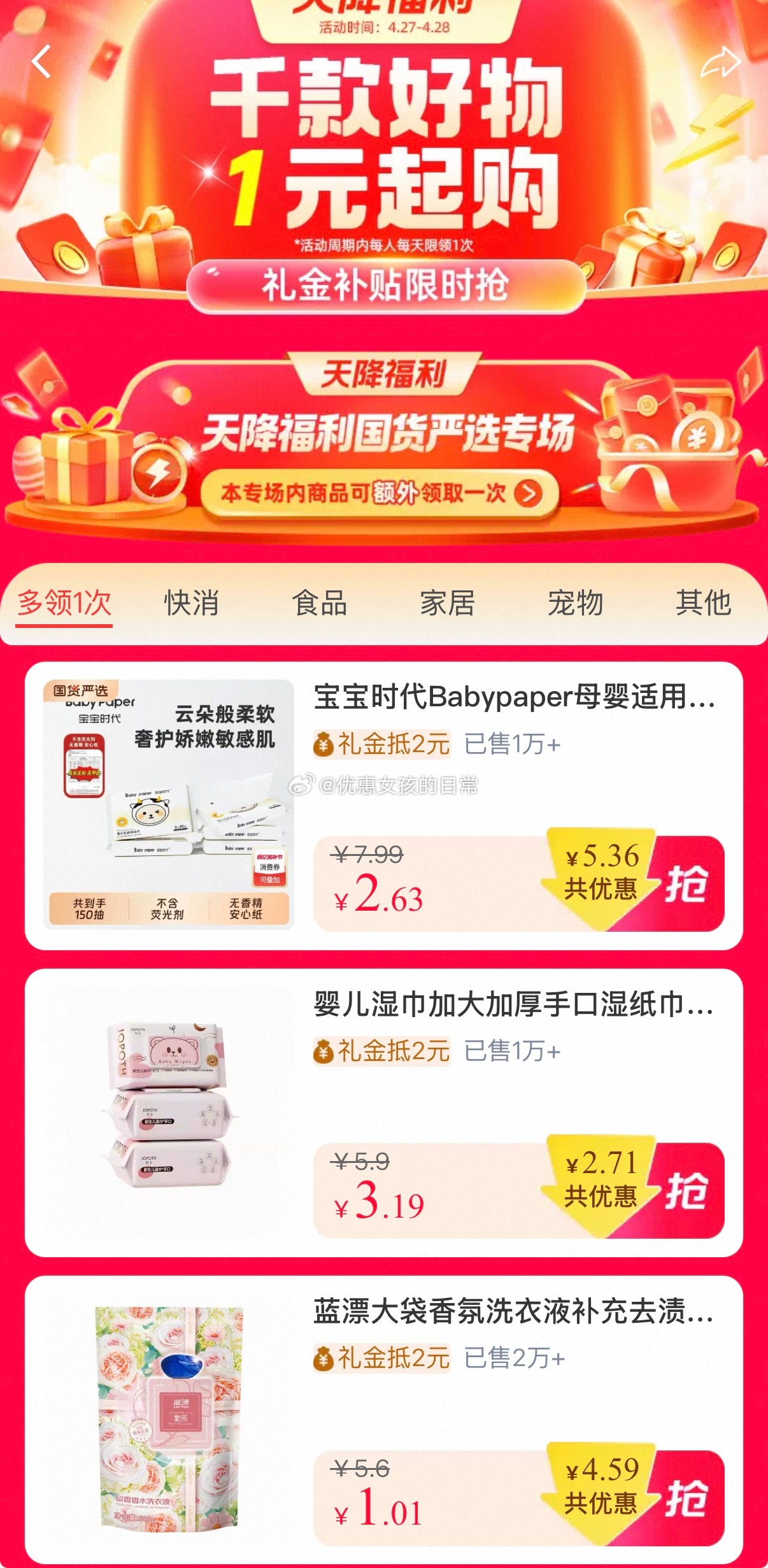 天降福利会场 网页链接、网页链接(以上领礼金到手1元起,两会场每天分别限领一次礼金) 比如买: 漫花悬挂抽纸920张,1.39 漫花大包悬挂抽纸家用实惠装便携湿巾湿厕纸手帕纸洁净出行集合RS 蓝漂悬挂抽纸800张,1.5 800张抽纸悬挂式家用实惠装卫生纸餐巾面巾纸抽厕纸手纸原生竹SJ