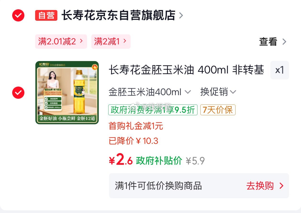 长寿花玉米油400ml 入会首单2.9元🧧