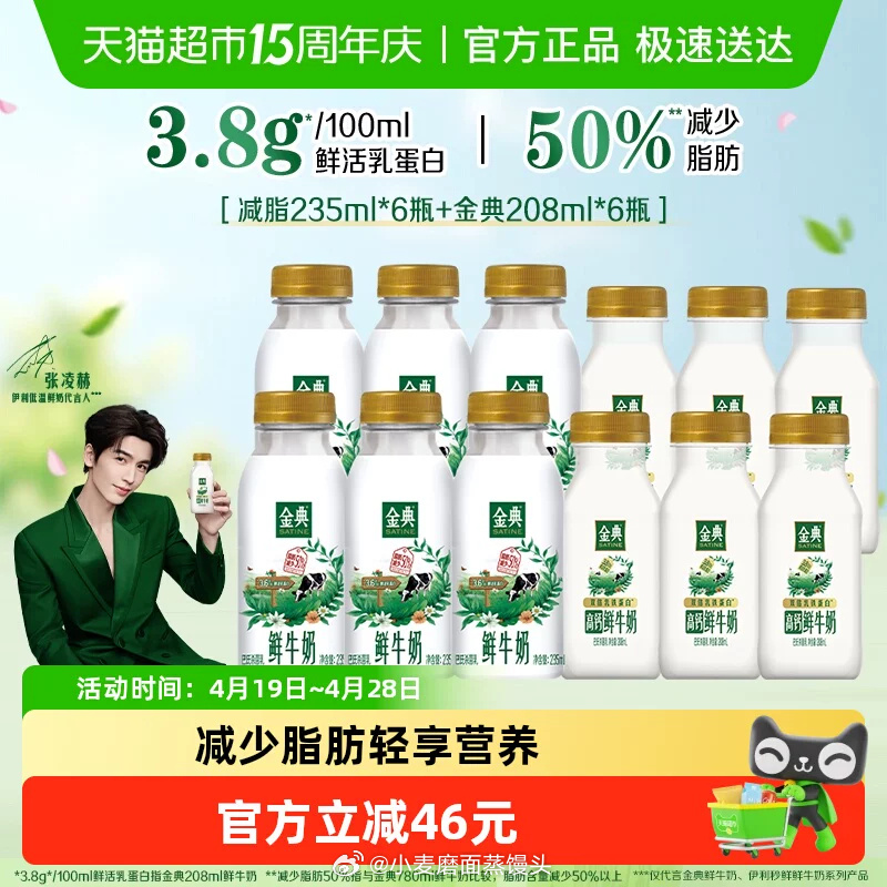 金典减脂鲜牛奶235ml*6瓶+金典高钙208ml*6瓶详情页点开第一个直播图,加购1件,领9折。再去点开第二个金币图,加购1件。购物车改成1件,自动变成37左右。自己凑一下消费券,可到手32左右。【下拉领优惠】伊利金典减脂鲜牛奶235ml*6瓶+金典高钙208ml*6瓶