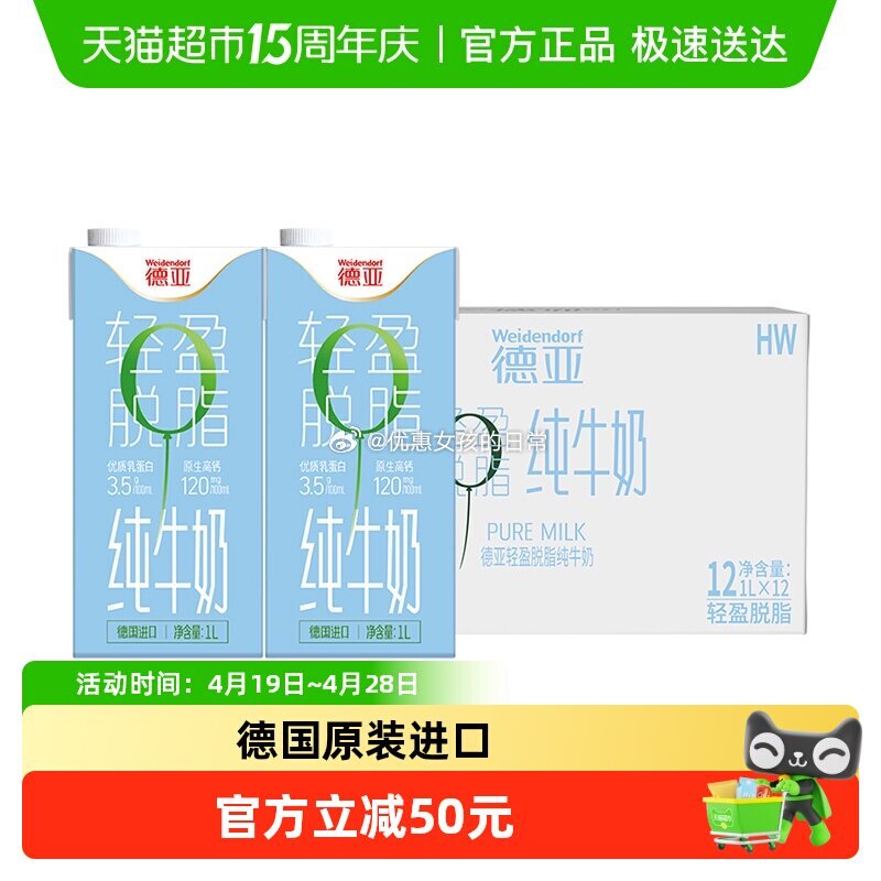 猫超 德亚脱脂纯牛奶1L*12盒,领礼金【进口】德国德亚脱脂纯牛奶 健身营养早餐牛奶大奶整箱装 超市首页底部-点“一键领取” ,部分有65-8红包 部分地区有补贴25,去淘金币页面-足迹抵扣 网页链接 商品下领149-15,vip到手【54.87】