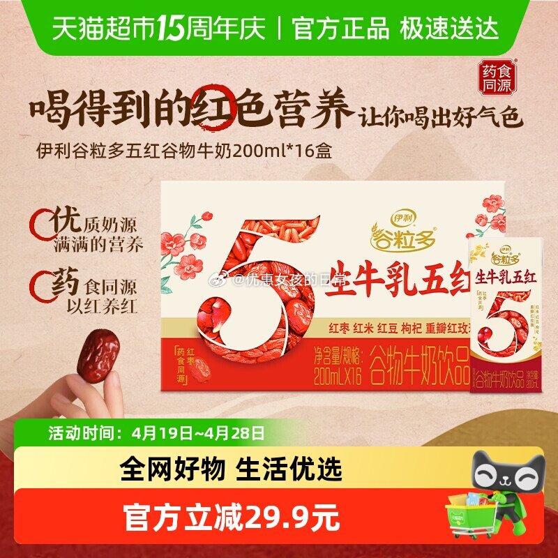伊利谷粒多五红牛奶16盒,补贴后14到手