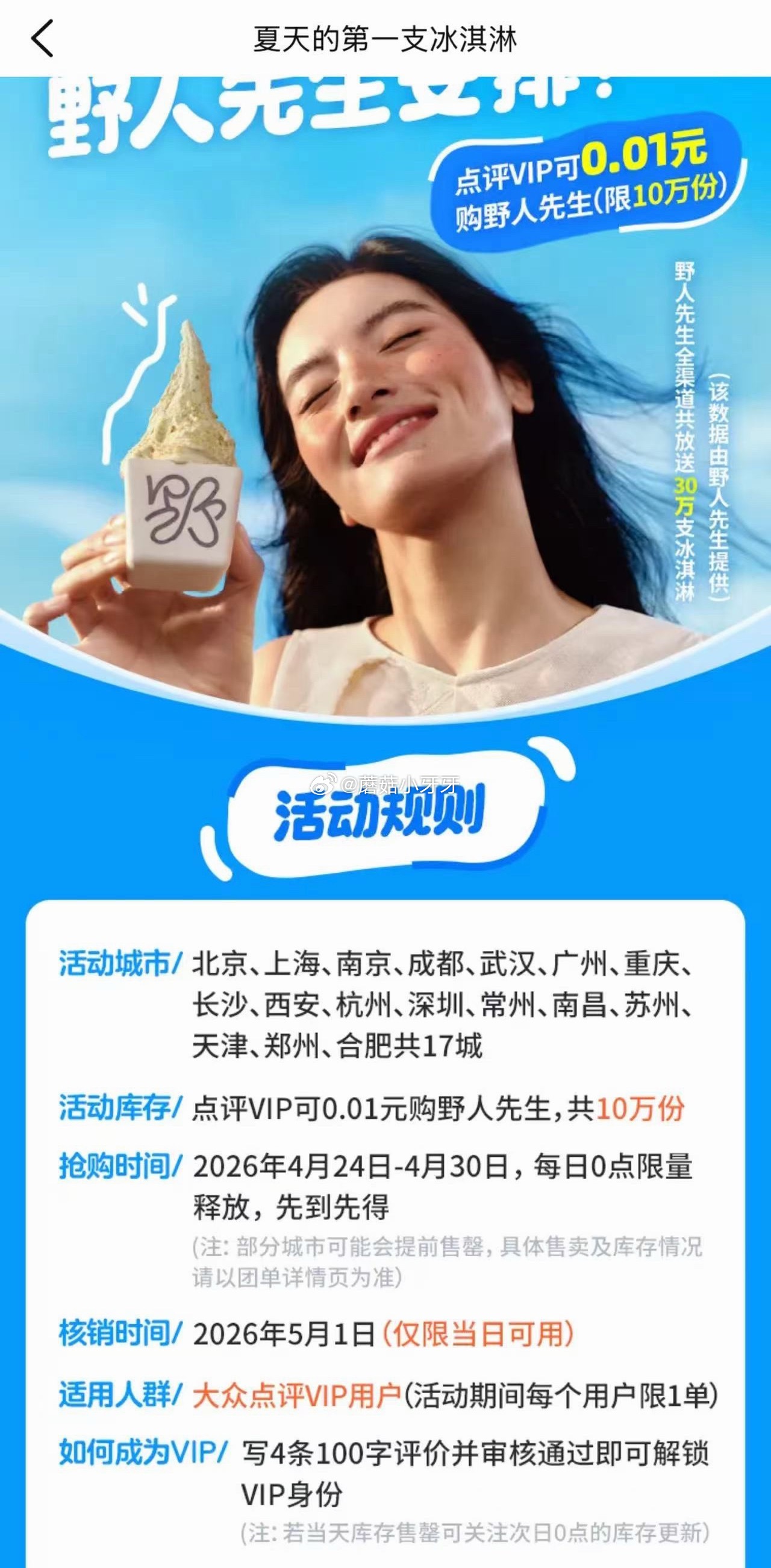 点评VIP可抢0.01冰淇淋券,限17城参与