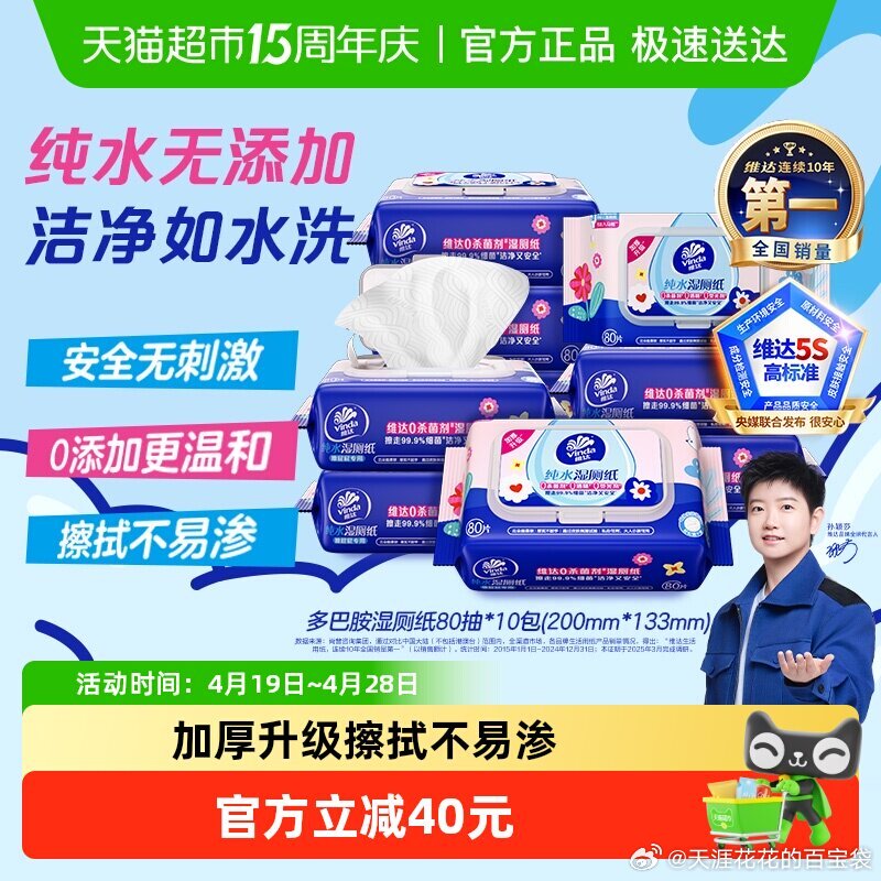 猫超: 维达 湿厕纸80抽*10包 标题下方可领99-10猫超券 去【天猫超市】直播间领9折直播券加购 直播间概率弹出39-5闪购红包 淘金币会场加购抵扣8.3,到手【43】 【详情享优惠】维达多巴胺湿厕纸纯水温和安全0添加湿巾