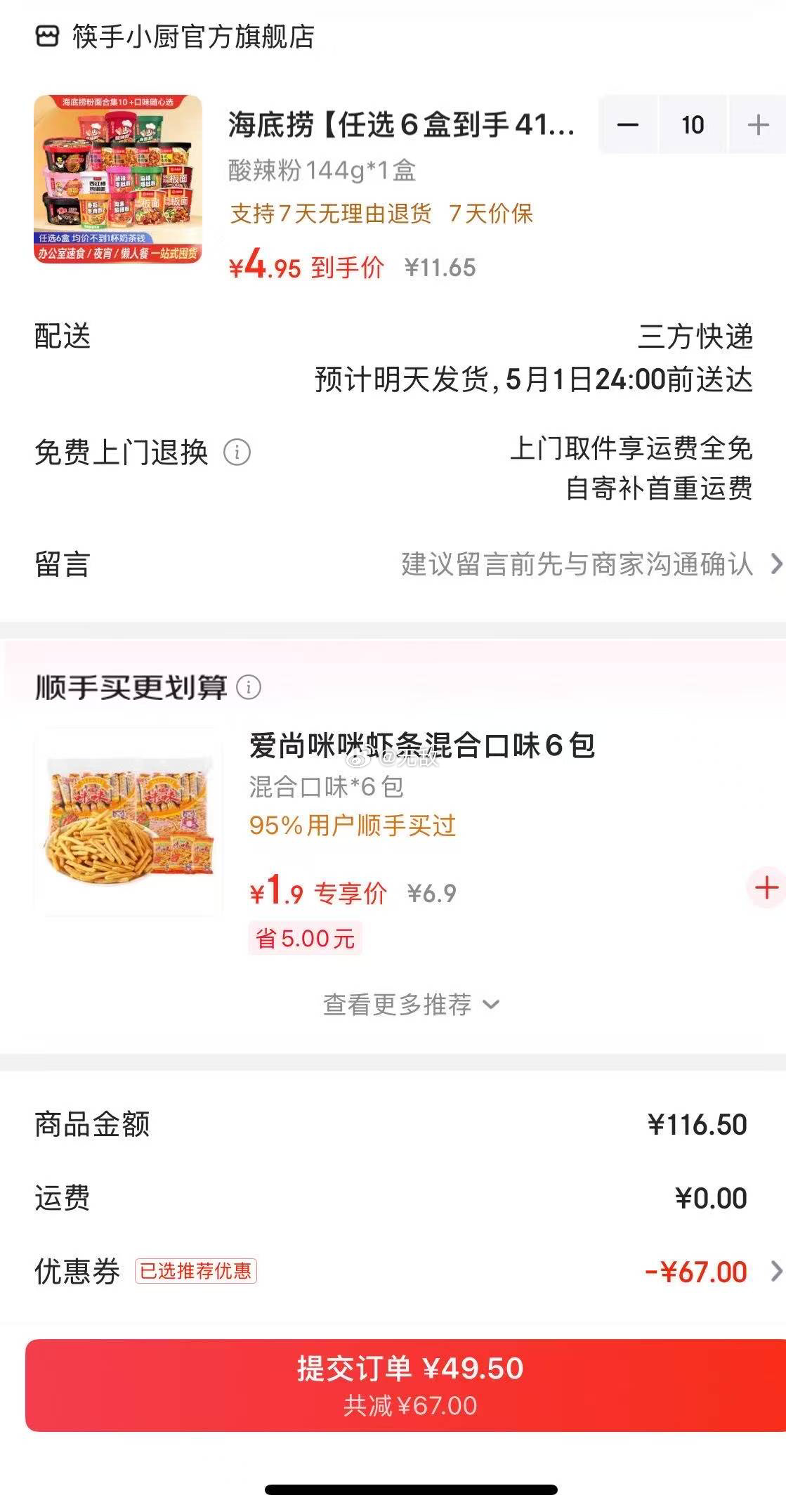 [购物]筷手小厨、海底捞任选10件仅49.5元