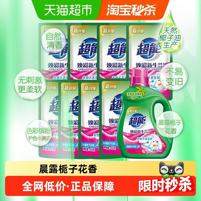 淘宝搜【淘宝秒杀】-整点抢红包领30-5 超能双离子洗衣液11斤,秒杀页面搜索标题加购,vip【30.9】 领券页面显示返1元猫超红包 (每天一次) 超能双离子洗衣液超值11斤1瓶8袋护色护衣焕彩新生无刺激栀子香