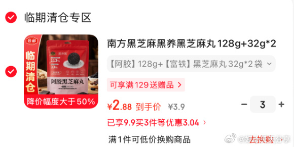 京东南方黑芝麻丸128g临期清仓价2.96元