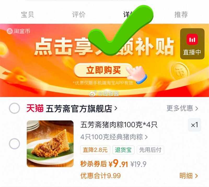 🎉五芳斋欢禧肉粽100g*4只 9.9淘金币价