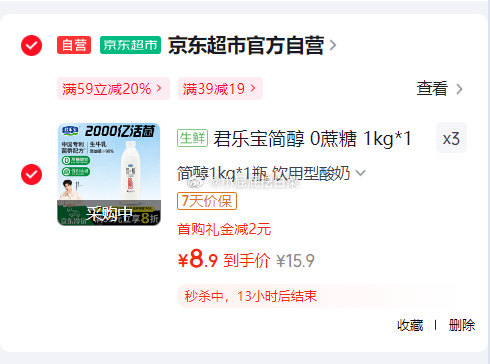 君乐宝简醇 0蔗糖 1kg*1瓶,加购3件 折合8.9/件