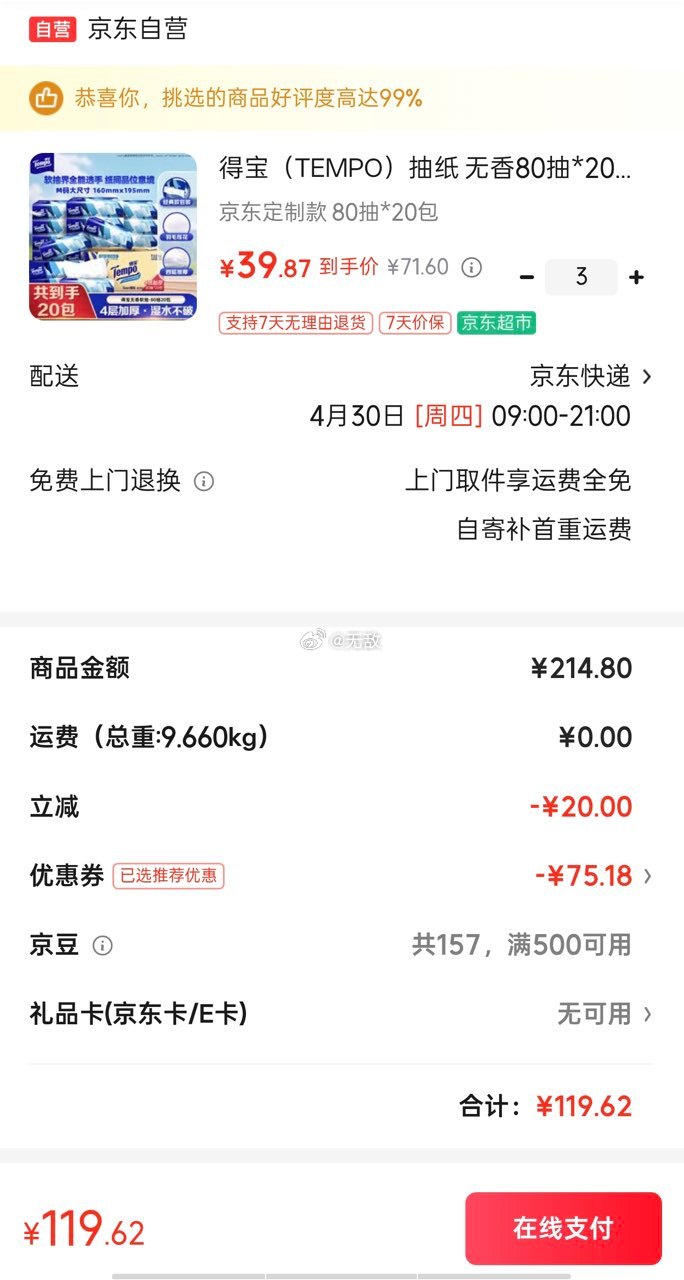 65折捡漏得宝抽纸80抽×20包