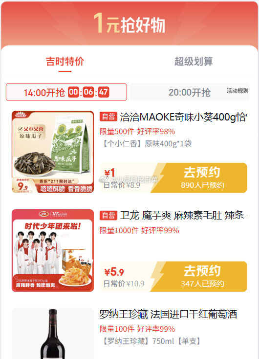 14点 网页链接 【吉时特价】页面下拉多款1元京东app顶部切换“特价”,可领取5.9-5券京东app顶部切换“特价”,再到9.9包邮栏,领4.9-4券网页链接 外卖29-20券网页链接 医疗器械膨胀券网页链接 汪贝秒杀网页链接 美妆秒杀