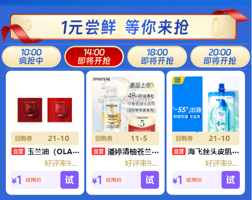 试用14点网页链接 潘婷 清柚苍兰3三分钟奇迹洗发水50g,1网页链接 玉兰油 全新第5代超红瓶面霜1.5g*2,1网页链接 海飞丝 控油去屑洗头膏40g,1网页链接 汰渍净渍洗衣原液雨后山茶花50g*4袋,1网页链接 佳洁士 焕齿白健康美白养龈牙膏40g,1网页链接 OLAY 莹亮臻护精华磨砂膏20g,1网页链接 潘婷 玫瑰香氛高浓发膜12ML,1
