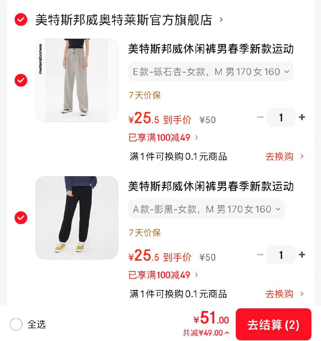 🧧领100-49券!美特斯邦威休闲裤任选2件25.5/件