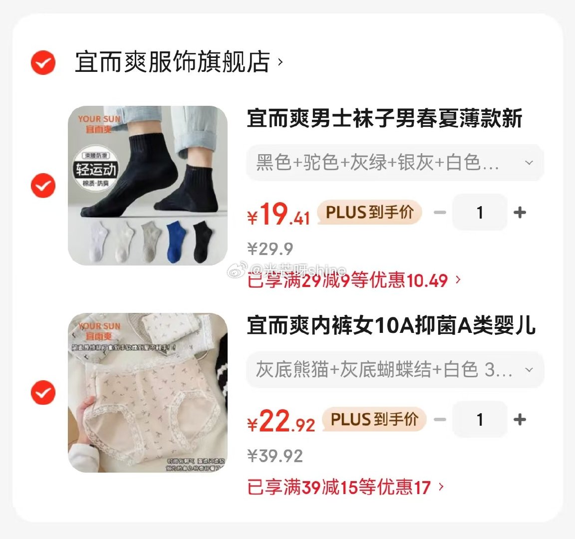 宜而爽 男士袜子防臭短袜 5双【19.4】 宜而爽男士袜子男春夏薄款新疆长绒棉运动足弓束腰防滑舒适透气防臭短袜 黑色+驼... 宜而爽 内裤女10A抑菌A类婴儿棉 3条【22.9】 宜而爽内裤女10A抑菌A类婴儿棉蕾丝碎花高弹透气舒适中腰少女平角短裤 灰底熊...
