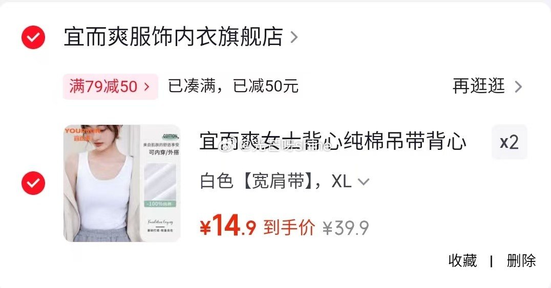宜而爽 女士内裤10A抑菌全棉底档 3条【22.9】 宜而爽女士内裤10A抑菌全棉底档高弹无痕舒适透气中腰甜美少女三角短裤 浅紫,... 领79-50 网页链接 宜而爽 女士背心纯棉吊带背心,任选2件【29】 宜而爽女士背心纯棉吊带背心女春夏内搭外穿薄款打底性感美背防走光上衣 白色【宽...