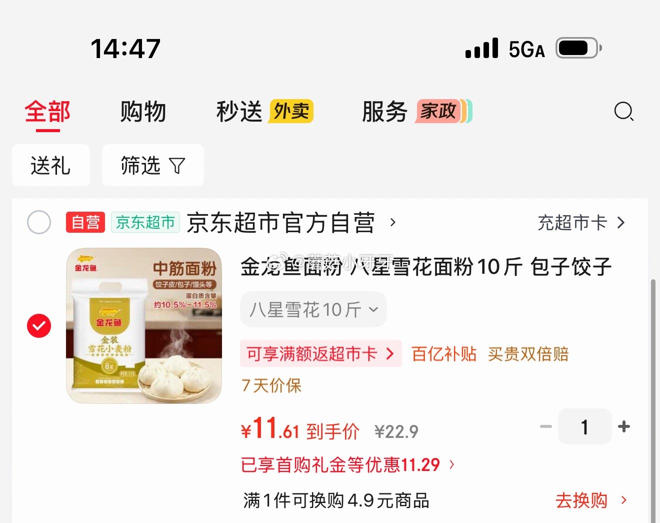 京东金龙鱼雪花面粉10斤凑单仅11.61💰