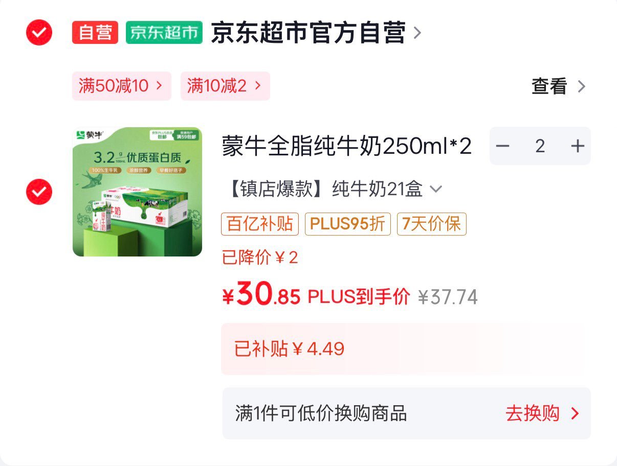 🥛蒙牛全脂纯牛奶拍2件61.7元