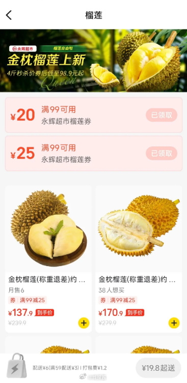 永辉超市,榴莲有好价