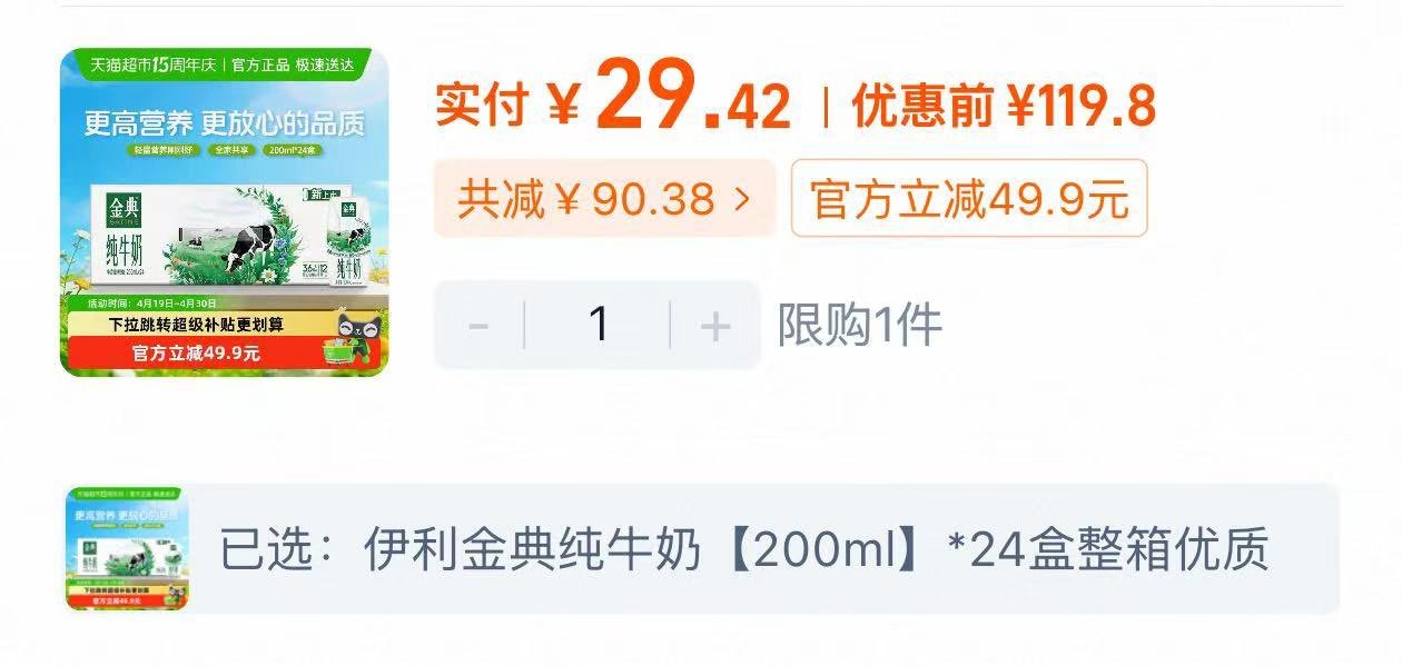 伊利金典纯牛奶24盒,桃金币后29.42元