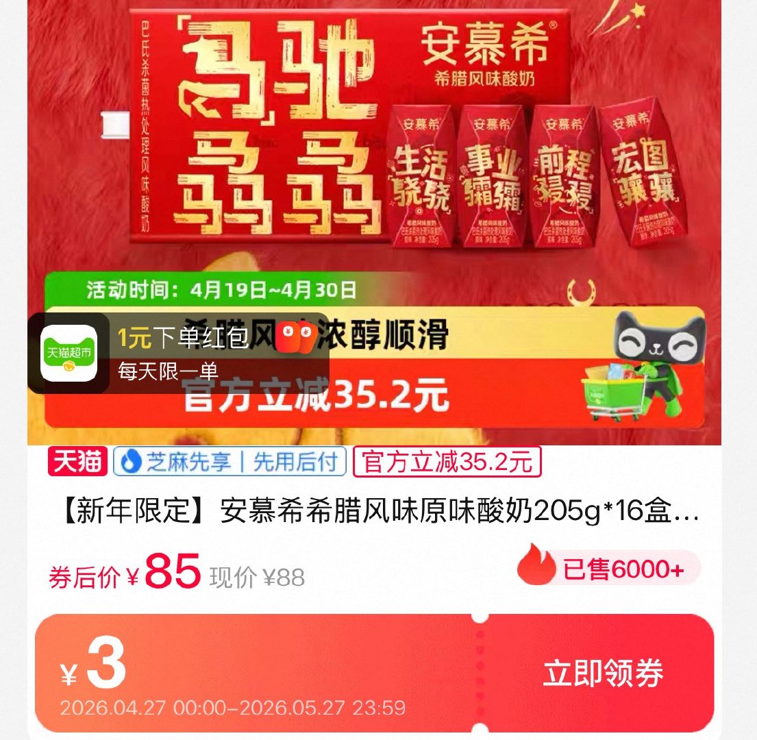 安慕希希腊酸奶205g*16盒 补贴后26元
