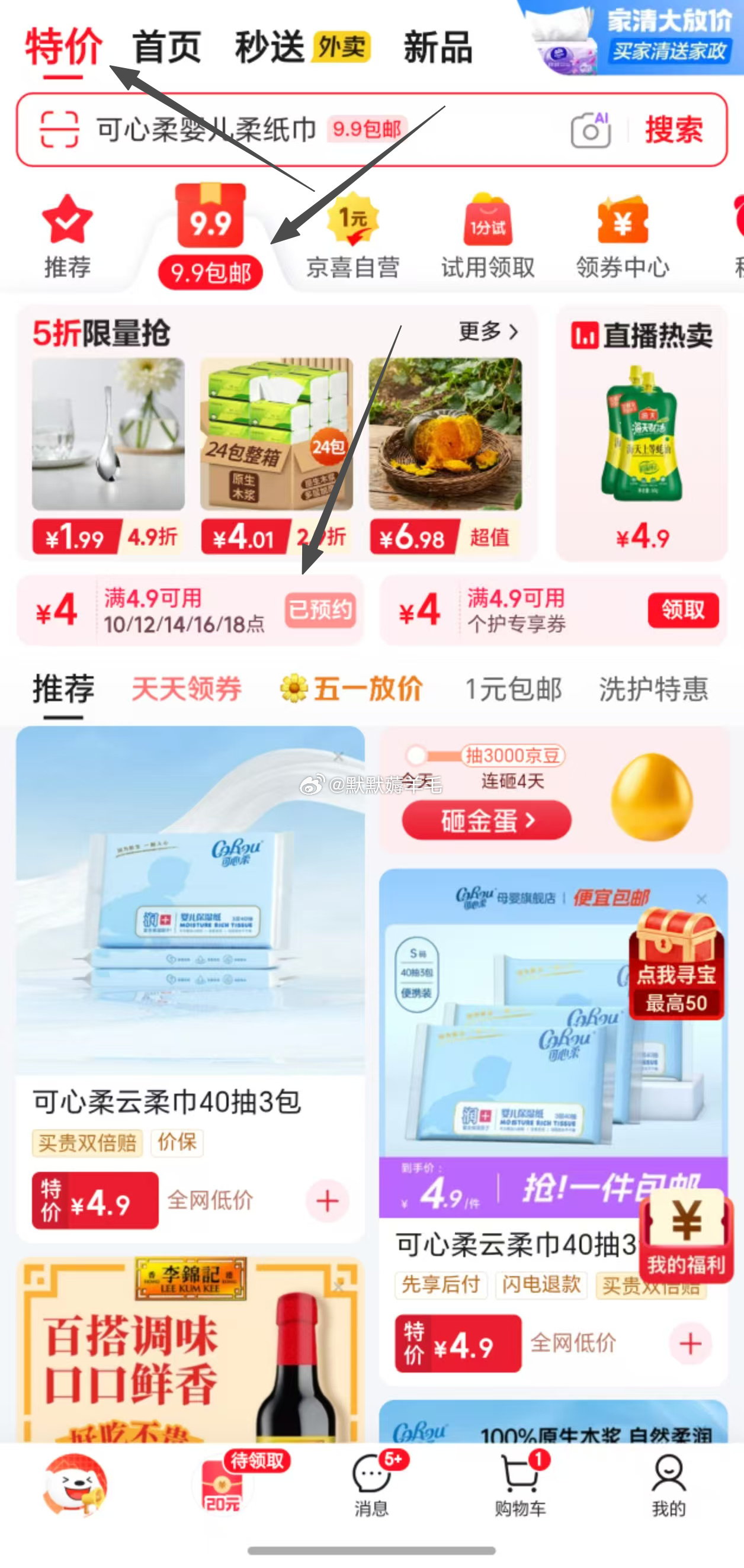 看自己的页面是否有4.9-4券(京东—特价—9.9包邮)